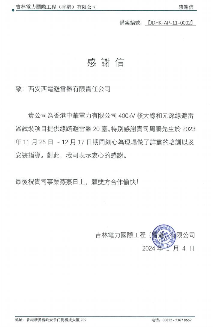 吉林电力国际(香港)工程有限公司的感谢信是对我公司在该工程履约工作方面的高度认可,充分体现了客户对西电避雷器工作人员的肯定与赞扬,更激励着我们继续不断提升服务质量和卓越表现的决心。我们将继续秉承“客户至上,诚信服务”的核心价值观,为客户提供更多优质的服务。