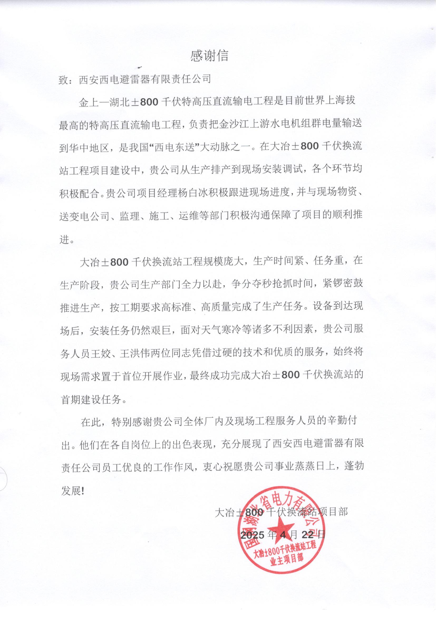 4月22日,多盈(中国)收到国网湖北省电力有限公司感谢信,我公司营销及售后服务人员在金上-湖北±800千伏特高压直流输电工程中安装调试过程中展现出的专业、高效的职业素养及严谨、细致的精神风貌,表示肯定和感谢!